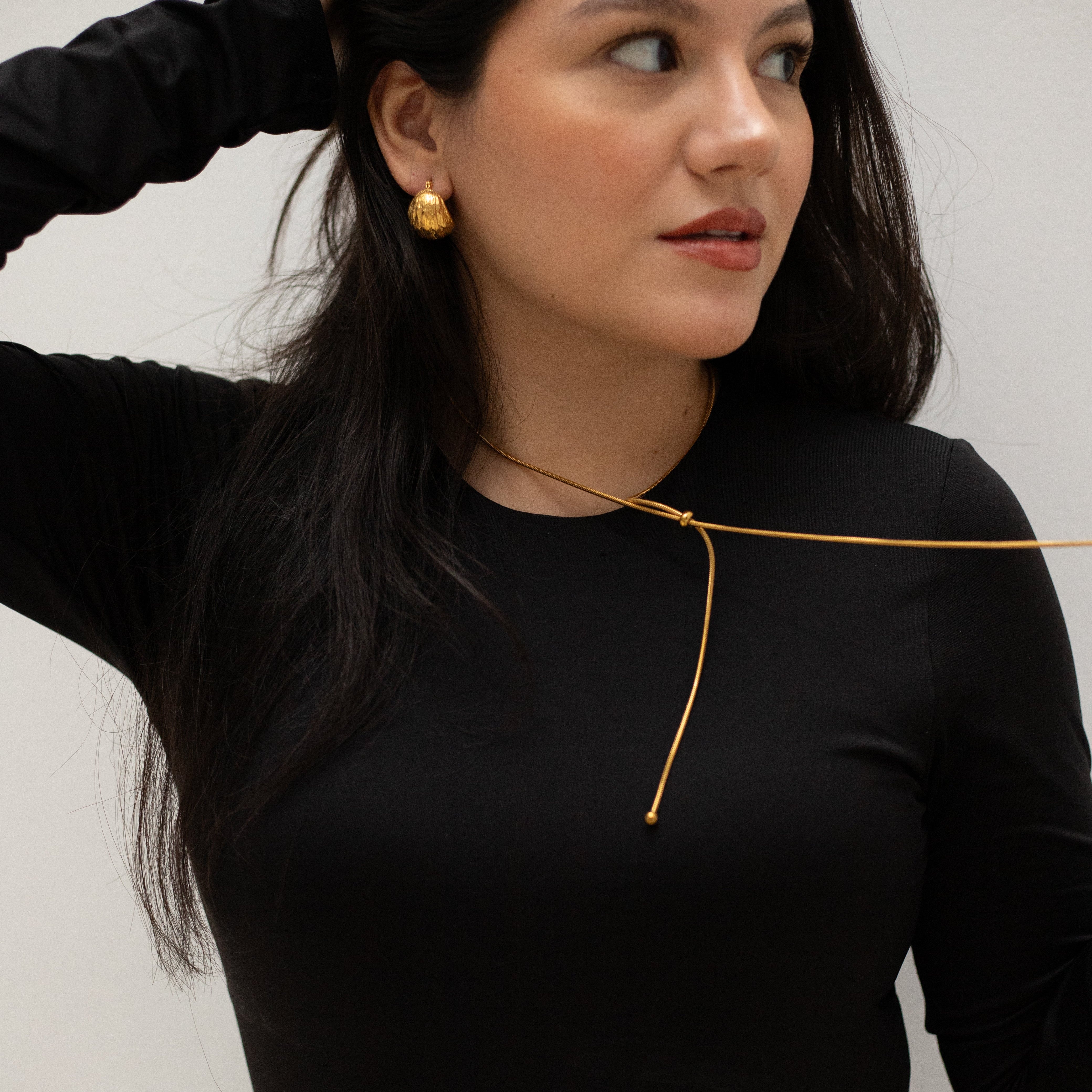 Aretes dorados de silueta curva que añaden presencia y estilo. Su textura artesanal aporta un acabado único, ideal para looks sobrios y sofisticados.