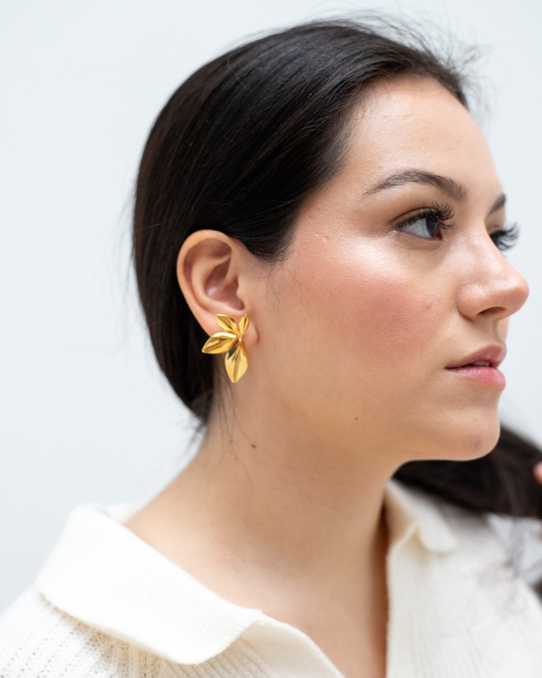 Aretes dorados con diseño de hojas en acabado pulido. Una pieza elegante y llamativa que aporta un toque femenino y sofisticado a cualquier look.