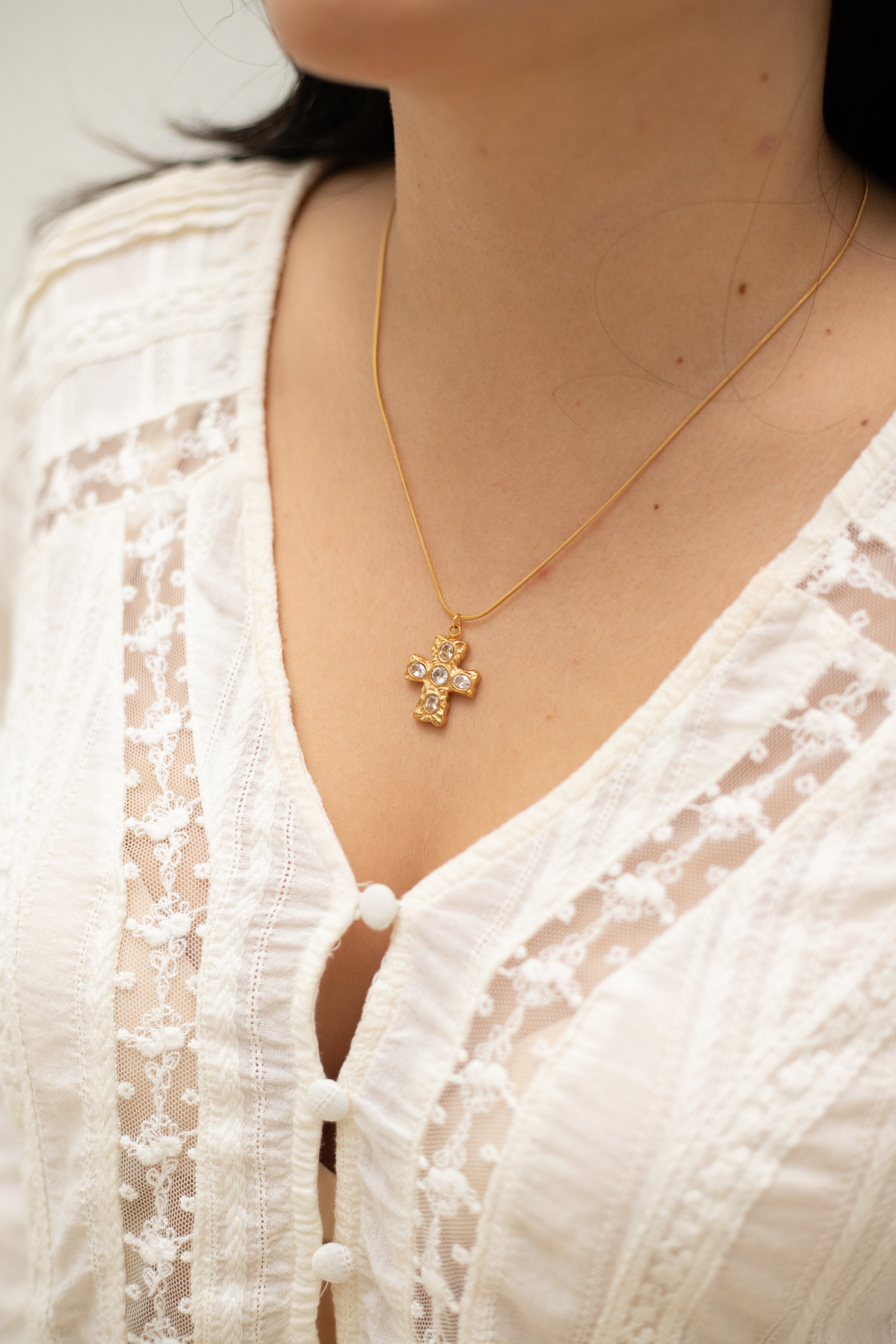 Un collar elegante y lleno de luz. Su dije estilo cruz con cristales en relieve aporta un toque sofisticado y atemporal, ideal para elevar cualquier look con delicadeza y brillo.